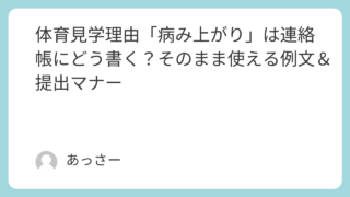 学校 体育見学理由「病み上がり」は連絡帳にどう書く?そのまま使える例文&提出マナー 病み上がりで体育を見学したいけれど、どう書けばいいのか迷っていませんか。高校生になると、自分で連絡帳や生徒手帳を書く場面も増え、より正確で丁寧な伝え方が求められます。この記事では、体育見学理由が病み上がりの場合の判断基準から、先生に伝わる書... 学校