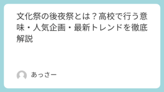 文化祭 文化祭の後夜祭とは?高校で行う意味・人気企画・最新トレンドを徹底解説 「文化祭の後夜祭とは?」という疑問に答えながら、人気の定番企画、最新のデジタル演出、安全対策、そして前夜祭との違いまでをわかりやすく解説します。 文化祭