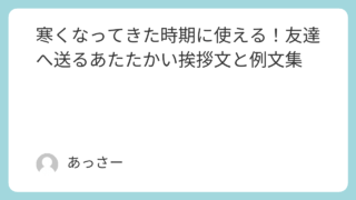 生活 寒くなってきた時期に使える!友達へ送るあたたかい挨拶文と例文集 気温が下がり、朝晩の空気に少し冷たさを感じる季節。そんなとき、ふと「寒くなってきたね」と友達に声をかけたくなる瞬間ってありますよね。でも、言葉にして伝えるとなると「どんな表現が自然かな?」と迷うことも。この記事では、寒くなってきた時期にぴっ... 生活