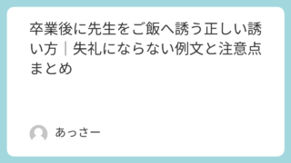 生活 卒業後に先生をご飯へ誘う正しい誘い方|失礼にならない例文と注意点まとめ 卒業後に先生をご飯へ誘いたいと思ったとき、「失礼にならないだろうか」「どう誘えば安心してもらえるのか」と悩む人は少なくありません。在学中とは立場が変わる一方で、先生には社会的な責任や周囲の目があるため、誘い方や条件には配慮が必要です。本記事... 生活